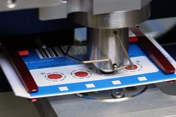 The blood sample needs to be extracted from the DBS card prior to the analysis. This was a major drawback of DBS previously. Sample extraction from a high number of DBS cards was very tedious and required many process steps to be performed manually. Hence, analysis of DBS was time-consuming and costly before the introduction of the CAMAG DBS-MS 500 instrument. The DBS-MS 500 enables fully automated sample recognition, integration of an internal standard to the DBS and direct sample extraction of the DBS from the card. The extract is guided online to an analytical system of choice (i.e. MS, LC-MS), and the system is cleaned after each extraction to prevent cross-contamination.